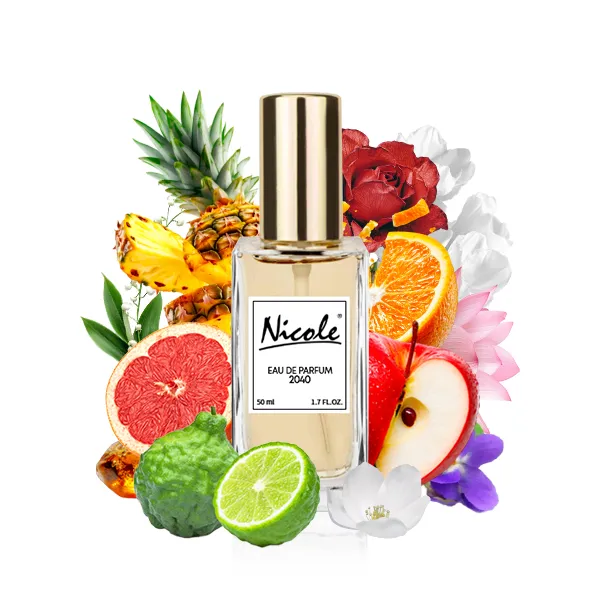 Nicole 2040 EDP is een bloemig-houtachtig parfum voor vrouwen. Deze parfum opent met verfrissende noten van ananas, bergamot, roos, sinaasappel en grapefruit. In het hart van de geur zijn warme en sensuele tonen van rode appel, lotus, hyacint, gardenia, lelie, viooltje, iris en fresia voelbaar. Deze vrouwelijke geur combineert topnoten van blauwe roos en citrus, hartnoten van fresia en viooltje, en basisnoten van amber, patchouli en witte muskus.